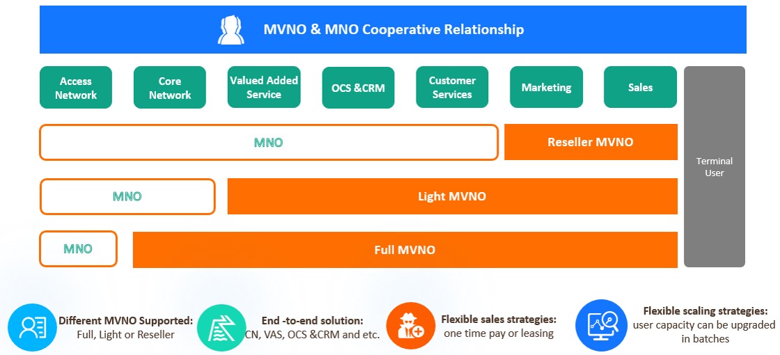 MVNO (Mobile Virtual Network Operator) system refers to an operational support system that does not own wireless spectrum or underlying network infrastructure, but leases network resources from traditional Mobile Network Operators (MNOs) and combines them with its own billing, customer management, and service platforms to provide users with personalized communication services. This system aims to help enterprises expand into vertical niche markets through differentiated market strategies and value-added services, while enabling rapid mobile service deployment at lower operational costs.